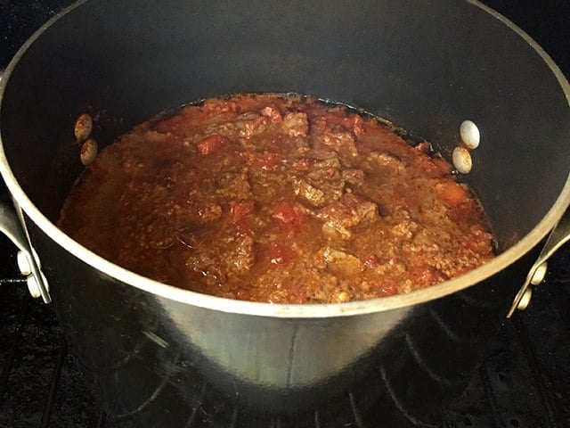 While simmering, cube the tri tip. Add the cubed tri tip, all of the spices, chiles, jalapenos garlic and wine. Stir to incorporate completely. Bring it back to a mild boil then turn down to a very low simmer and simmer for at least one hour to several hours. As the chili simmers, thin with water or broth if needed. If the chili is too thin for your liking, add masa.