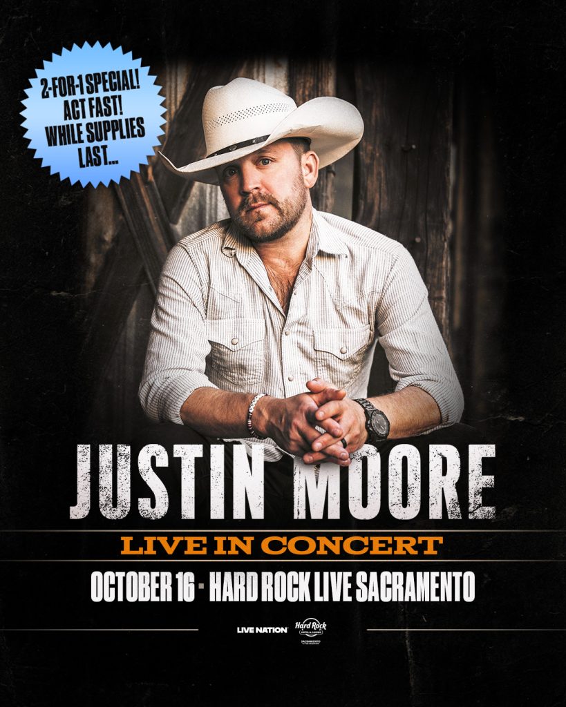 AND HERE’S MORE EXCITING NEWS! DON’T MISS OUT ON 2-FOR-1 JUSTIN MOORE TICKETS AT HARD ROCK LIVE SACRAMENTO. THAT’S RIGHT, SCORE A PAIR OF TICKETS FOR THE PRICE OF 1. ACT FAST WHILE SUPPLIES LAST.